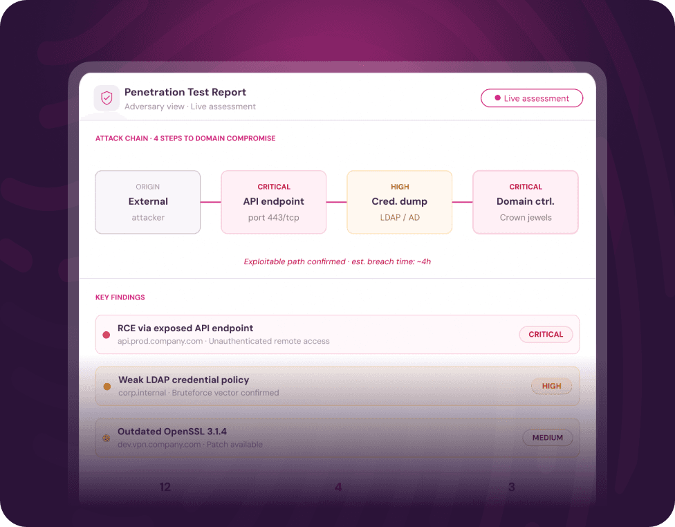 Detailed findings with reproduction steps, screenshots, and affected assets for your security and engineering teams.